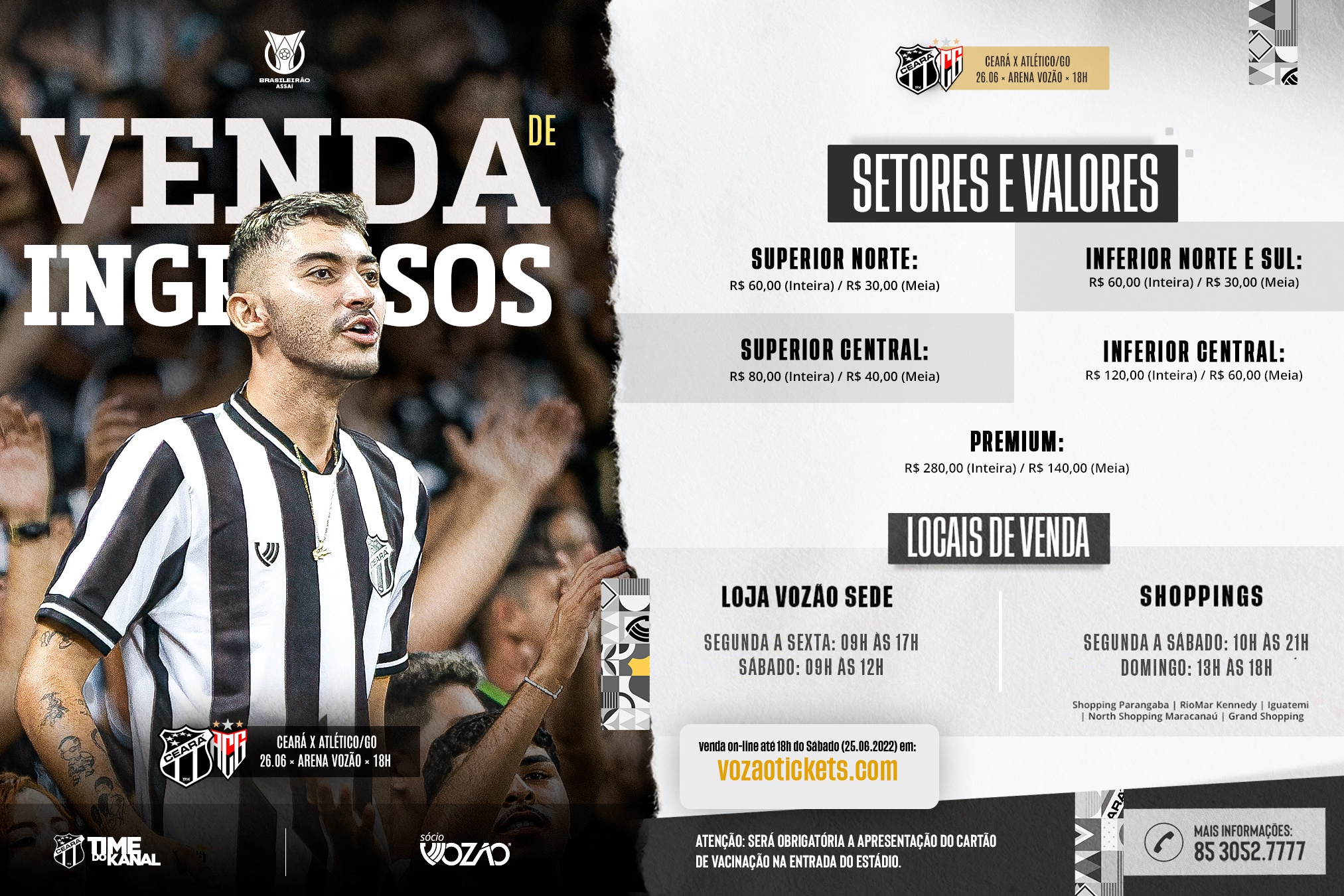 Em partida válida pela 14ª rodada do Brasileirão, o Ceará vai enfrentar a equipe do Atlético-GO no próximo domingo (26/06), às 18h, na Arena Vozão. Jogando em casa, o Alvinegro terá o apoio da torcida na arquibancada. A venda de ingressos para o duelo iniciará nesta sexta-feira (24/06), nas Lojas Vozão e na Vozão Tickets.