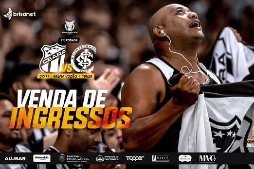 O Vozão enfrenta o Internacional na próxima quinta-feira, 07/11, às 19h30m, em partida válida pela 31ª rodada da Série A do Campeonato Brasileiro. Os ingressos para a partida começarão a ser vendidos nesta sexta-feira, 01/11, em todas as lojas Sou Mais Ceará e, também, na sede da Escolinha do Mais Querido, “Fábrica de Craques”, na Rua Major Weyne, 1040. Confira abaixo os setores disponibilizados e seus respectivos valores e acessos: