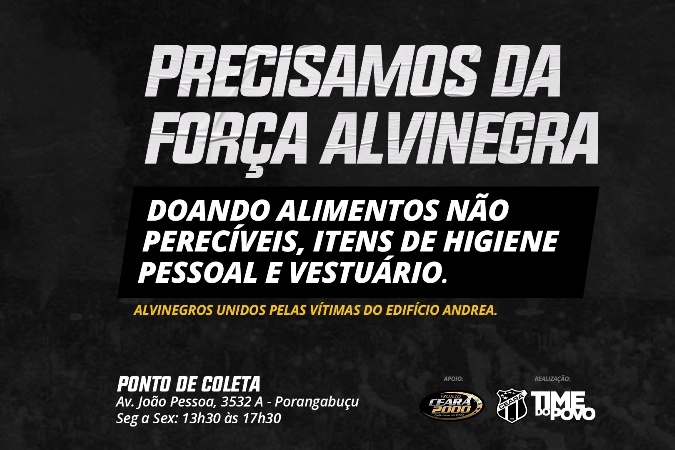 Diretora de Relações Públicas do Projeto Ceará 2000, Melka Sampaio, em nome do Projeto e do clube, convocou a Nação Alvinegra. “Gostaríamos de pedir o apoio de toda a torcida Alvinegra neste momento de solidariedade para com os nossos conterrâneos que passaram por um momento de tragédia com o desabamento do prédio Andrea. Vamos arrecadar materiais para os sobreviventes e os voluntários e toda ajuda é bem vinda”, afirmou.