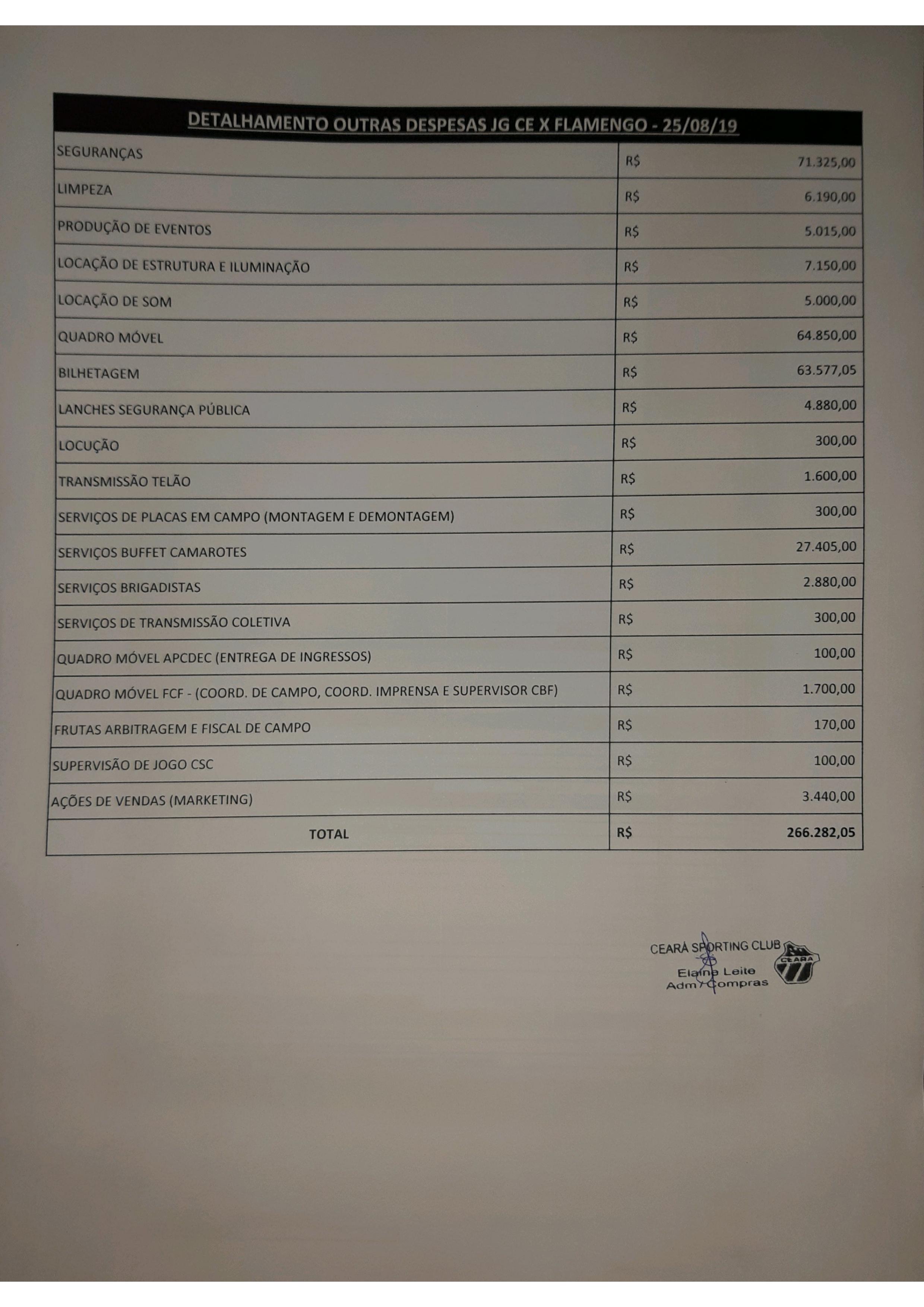 O Ceará Sporting Club torna público o detalhamento das “OUTRAS DEPESAS” referente ao borderô da partida realizada no último domingo, 25/08, na Arena Vozão entre Ceará e Flamengo.