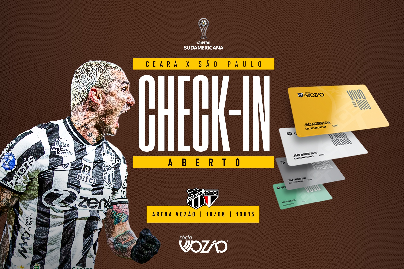 O Ceará encara a equipe do São Paulo nas quartas de final da CONMEBOL Sudamericana. Decidindo em casa, o Alvinegro recebe o time paulista no próximo dia 10/08, na Arena Castelão. Para o confronto ao lado da torcida, o Sócio Vozão já liberou na tarde desta terça-feira, 02/08, o check-in para os associados do clube.