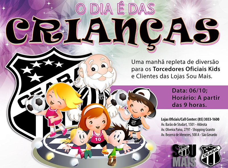 Para comemorar o Dia das Crianças, a garotada vai fazer a festa nas Lojas Oficiais do Ceará, pois, no próximo sábado, 06/10, a partir das 9 horas, será realizada uma manhã repleta de surpresas e brincadeiras para os Torcedores Oficias Kids e os pequenos clientes das Lojas Sou Mais.