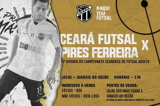 O Ceará volta à quadra pelo Campeonato Cearense de Futsal Adulto, no próximo sábado,18/05, às 17h, no Ginásio Vozão, contra a equipe do Pires Ferreira. Após estrear com vitória na competição por 4 a 0 sobre o Sumov, o Alvinegro encara agora seu segundo desafio na luta pelo título estadual.