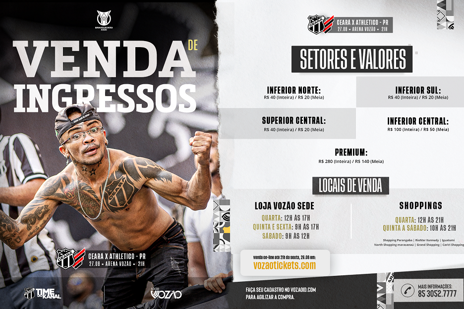 O Ceará vai entrar em campo no próximo sábado (27), pela 24ª rodada do Brasileirão, diante da equipe do Athletico Paranaense, às 21h, na Arena Castelão. Na terça-feira (23), o Sócio Vozão iniciou a liberação do check-in para os associados. Na tarde desta quarta-feira (24), a venda de ingressos foi iniciada para a Nação Alvinegra.