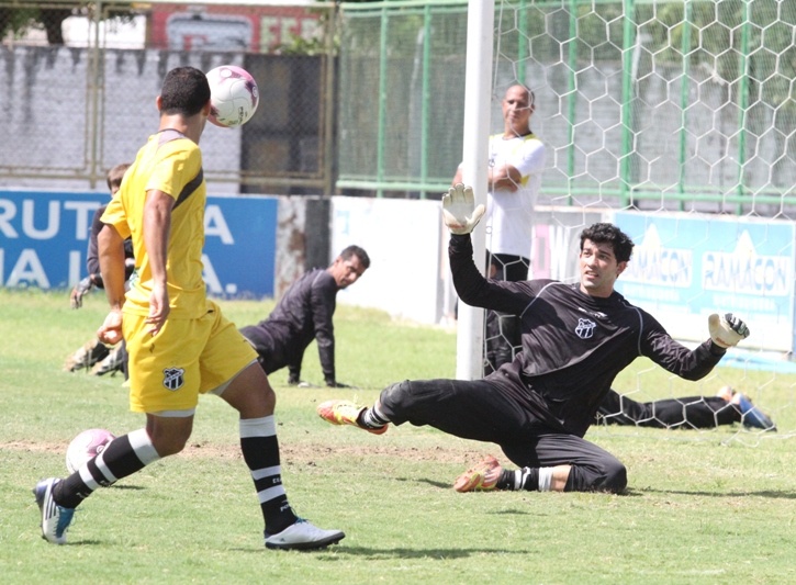 Aprimorando os arremates do seu grupo, PC Gusmão teve o auxílio de alguns bonecos, fixados no gramado. O objetivo do treinador alvinegro foi dificultar os cruzamentos e melhorar o posicionamento dos atacantes.